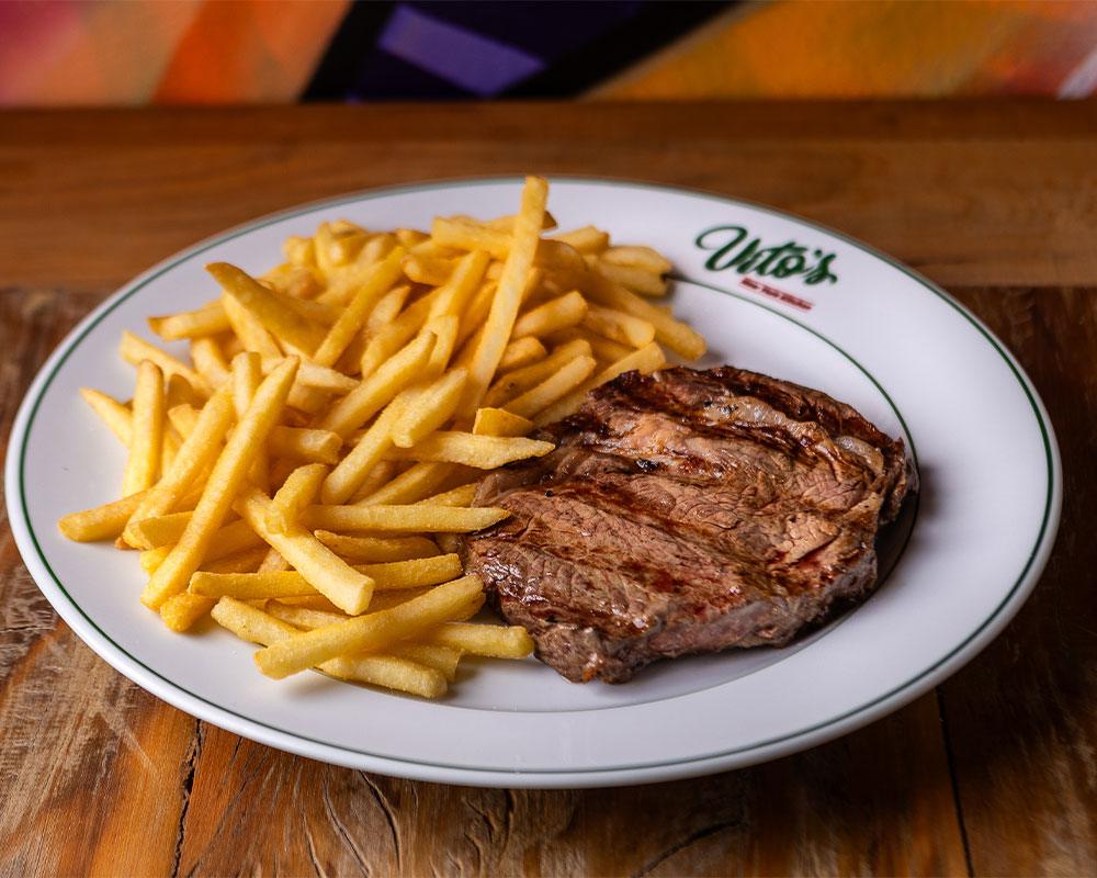 Dois Nós de Alho de entrada. Escolha entre Steak Vito’s ou Chicken Parmegiana, com batatas fritas ou uma pasta (Fettuccine Alfredo ou Spaghetti Marinara) e uma bebida não alcoólica.